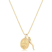 The perfect duo - our Fortuna necklace delicately strings St. Christopher - patron saint of travelers - and an Italian horn - representing safe travels and good fortune. This pendant necklace is with you for every adventure. 14k gold filled - this one stays on our necks and near our hearts at 18 inches in length. How we style our pendants: Created to layer with all our pieces, the style-outs are endless and effortless. We love to layer our pendants with our shorties and chains - if layering isn’t your thing, no worries! Complete the solo look with a solid wrist stack and a midi ring. Best worn with a glowing smile -- trust us, you got it! * Handmade item * 7/8" pendant diameter * 18" chain * 14k gold-filled chain, pendant and finishes